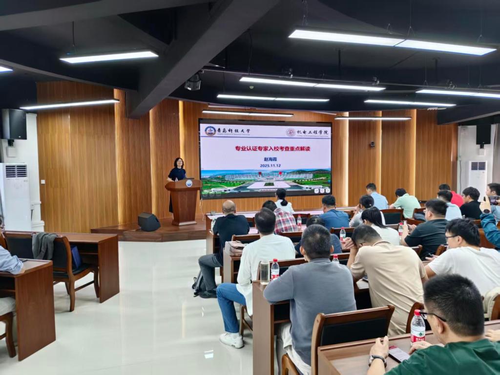 为迎接12月7日工程教育专业认证专家入校考查,全面做好认证准备工作,2025年11月12日下午,机械工程学院在海创楼(创新创业学院)303室举行了工程教育专业认证专家入校考查专题培训会,教育部工程教育认证专家青岛科技大学赵海霞教授做了《专业认证专家入校考查重点解读》主题报告,学院领导、机制专业必修课任课教师及其他相关教师参加了会议,会议由刘强副院长主持。